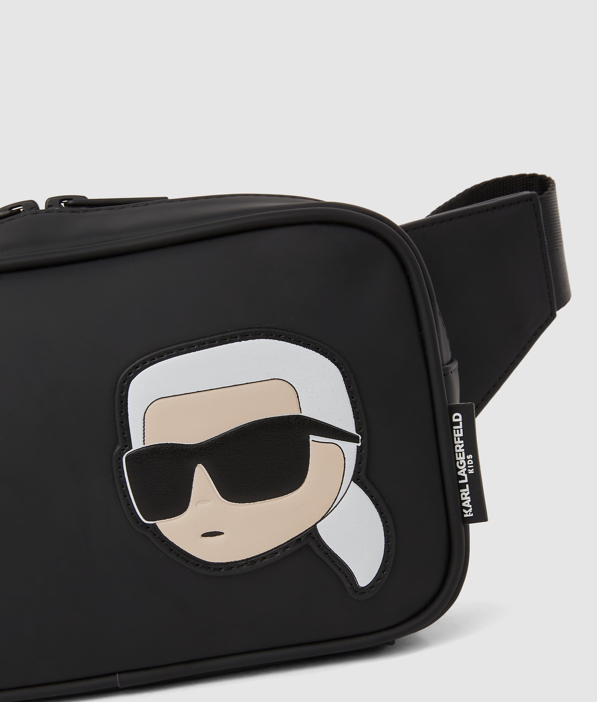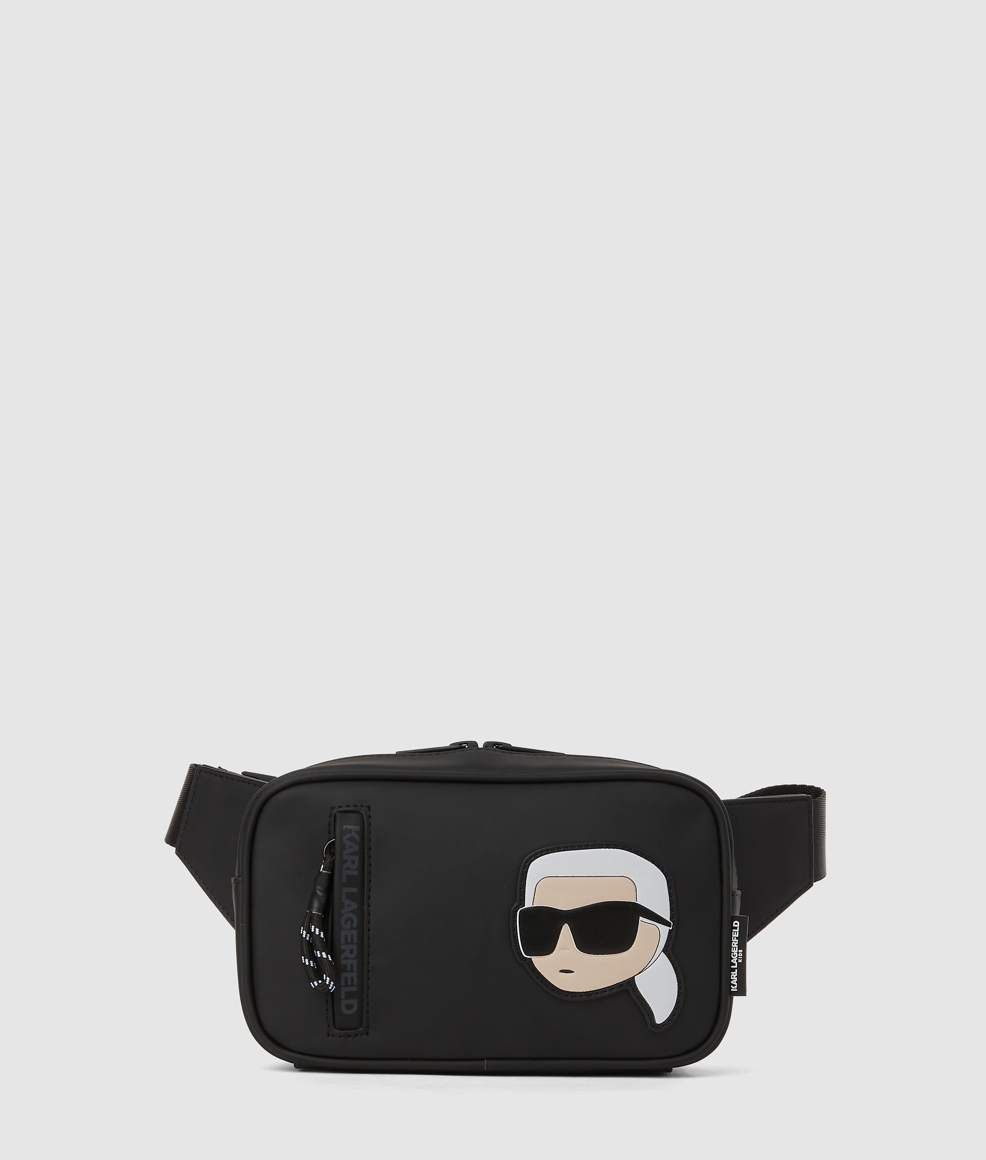 This coated. technical leather belt bag features bold Ikon Karl artwork. dual zip compartments. and an adjustable strap for hands-free days out.