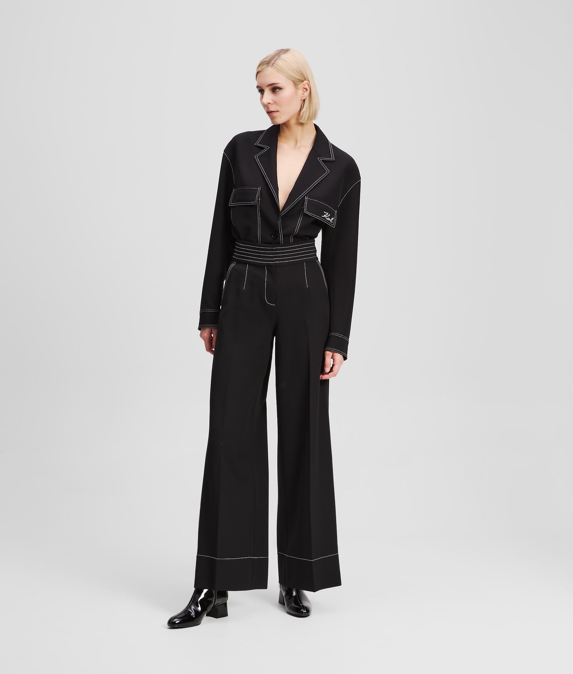 A striking contrast stitch design and flattering wide-leg silhouette define these must-have pants. Wear yours with the matching jacket for a complete. fashion-forward ensemble.