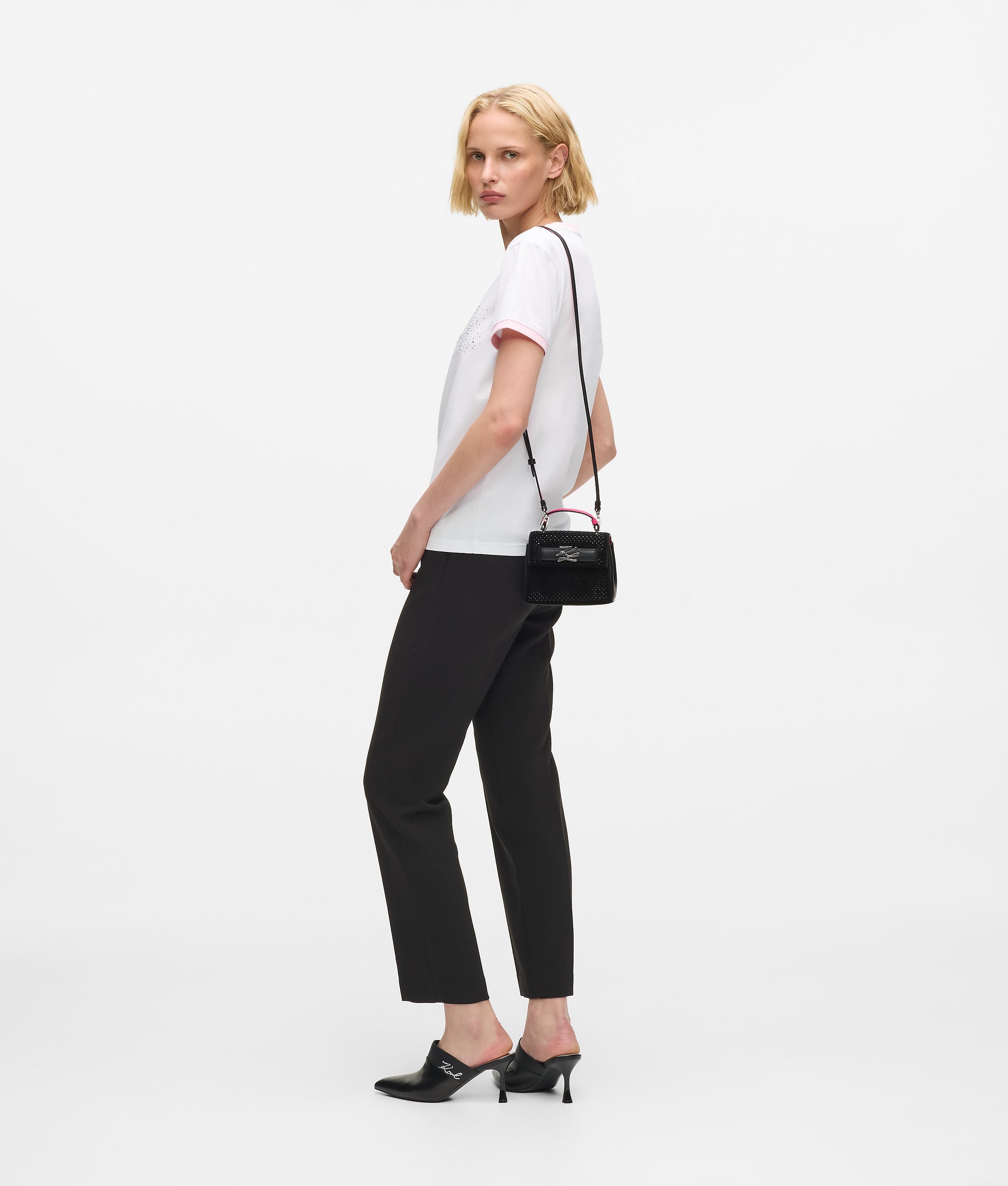 This nano bag proves that minimalism can still turn heads. Inspired by the unapologetic style of KARL LAGERFELD Brand Ambassador Paris Hilton. the compact suede silhouette shimmers with rhinestone embellishment and a flash of color-pop pink. Just enough space for lipstick. card. attitude ?? nothing else required.