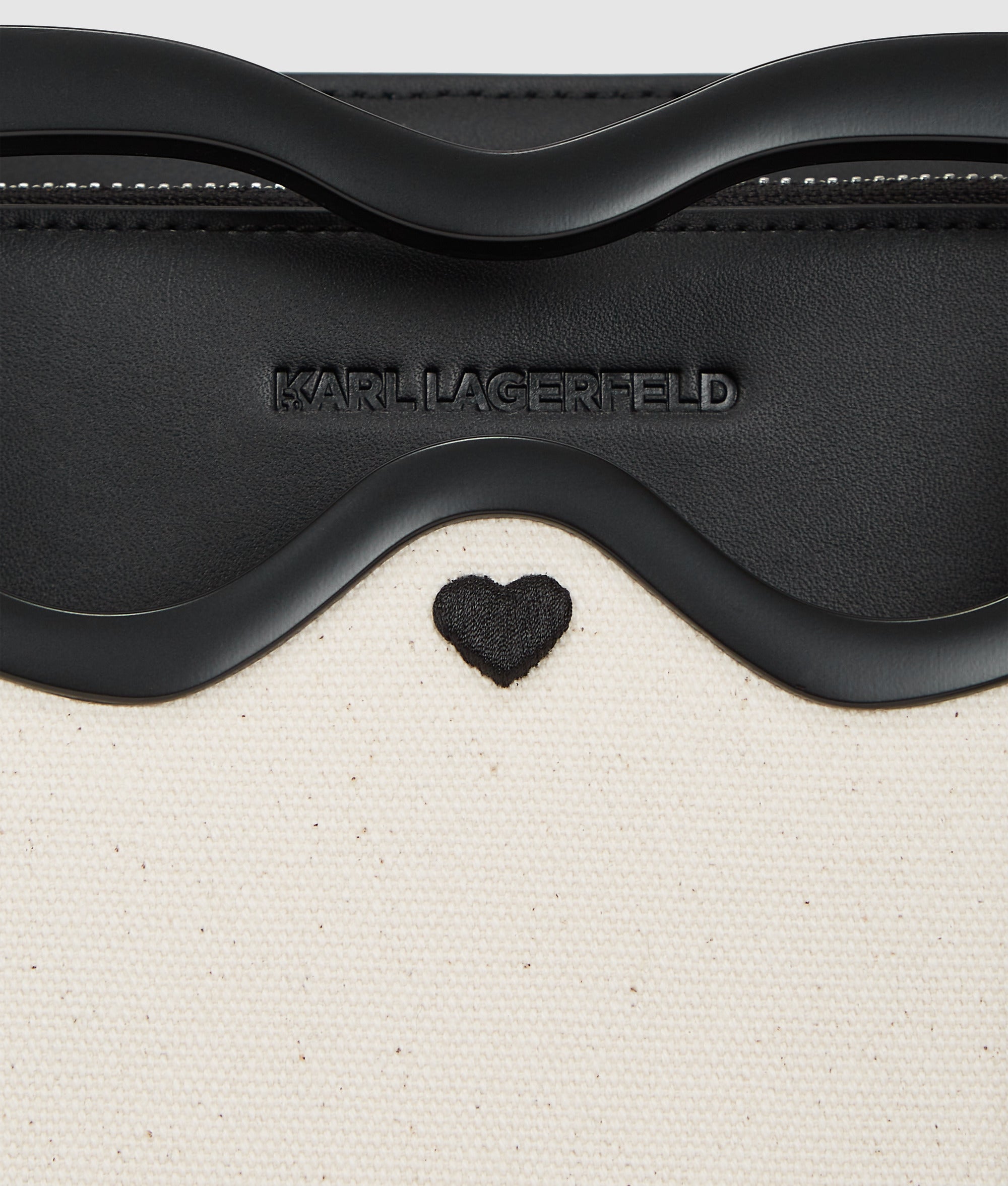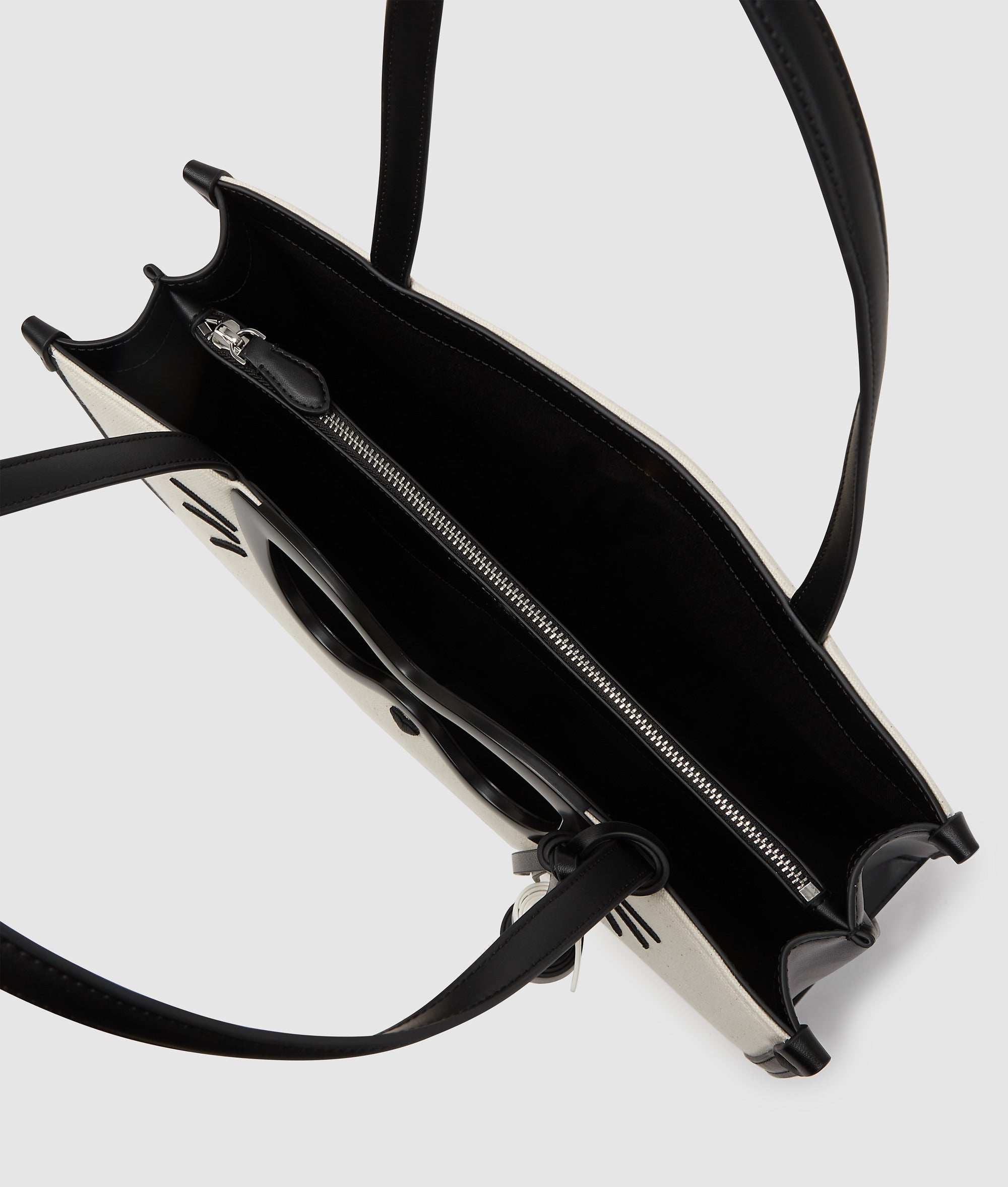 Woven recycled cotton shapes a structured tote framed by smooth technical leather trim. Twin straps and a playful handle detail bring subtle charm to everyday carry.