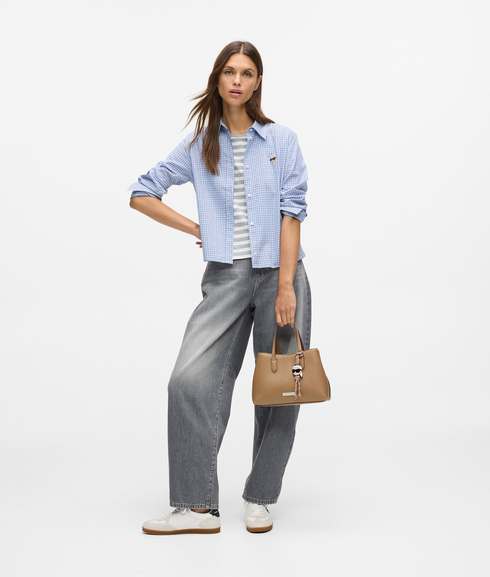 Showcasing a playful Ikon Karl charm. this small tote bag blends refinement with fun accents. Crafted from smooth technical leather. it has a secure button closure and detachable strap for versatile styling.