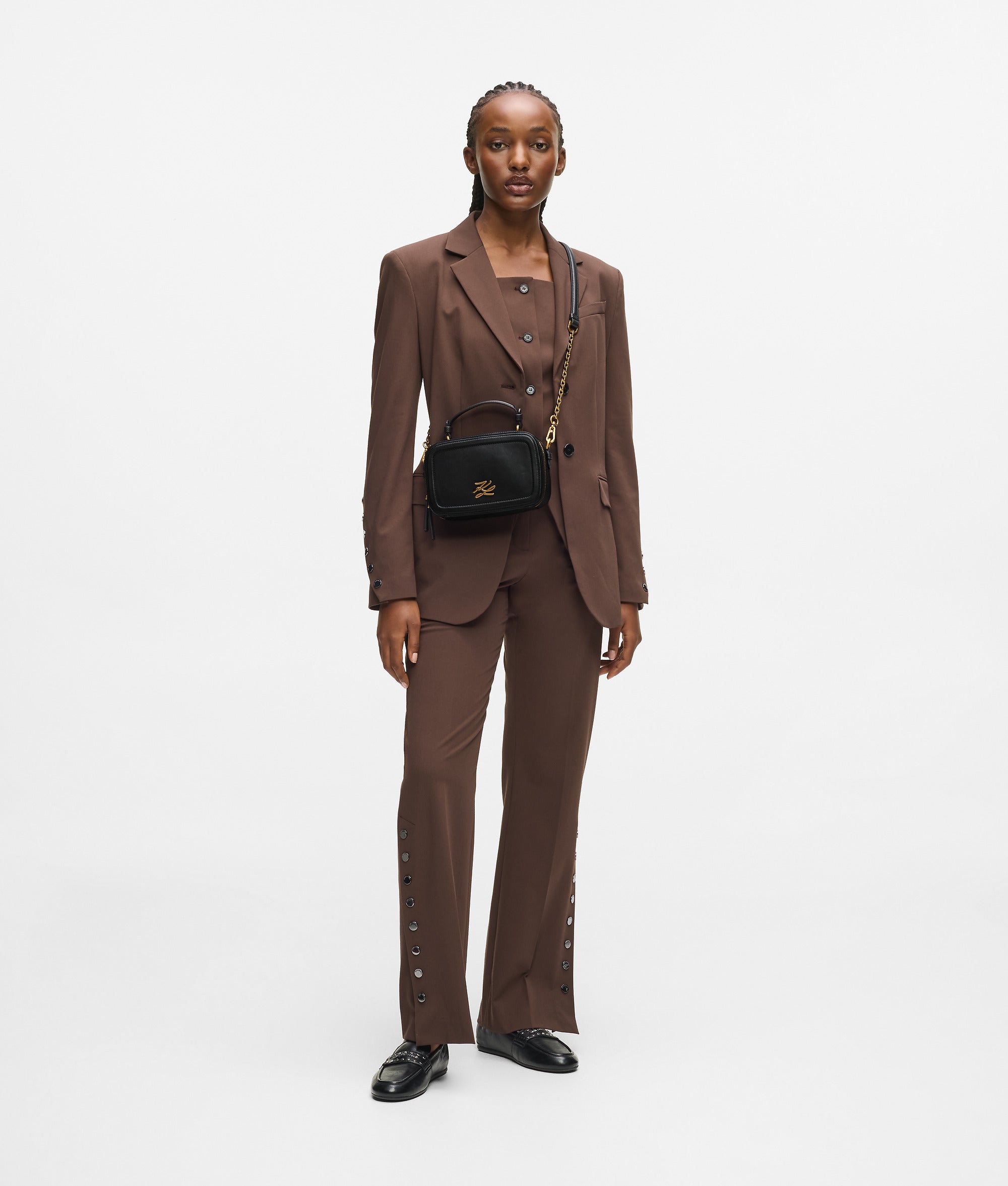 A structured rectangular silhouette defines this sophisticated top handle bag. with chain-embellished strap. The zip closure secures essentials. while Karl Autograph hardware adds a refined touch.