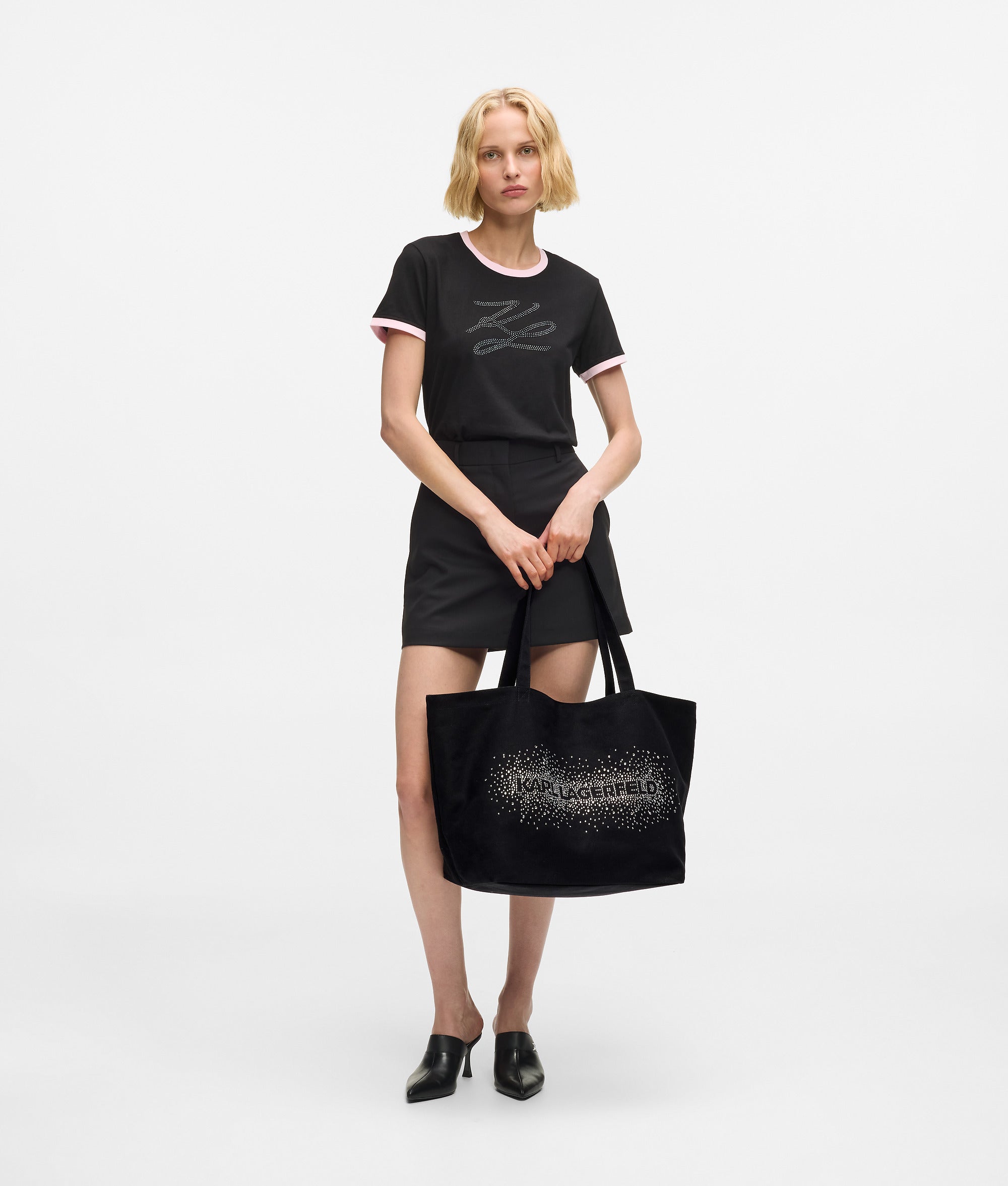 Add a touch of sparkle to your everyday accessories with this cotton shopper. embellished with shimmering rhinestones. Twin handles and a secure button closure offer enhanced functionality.