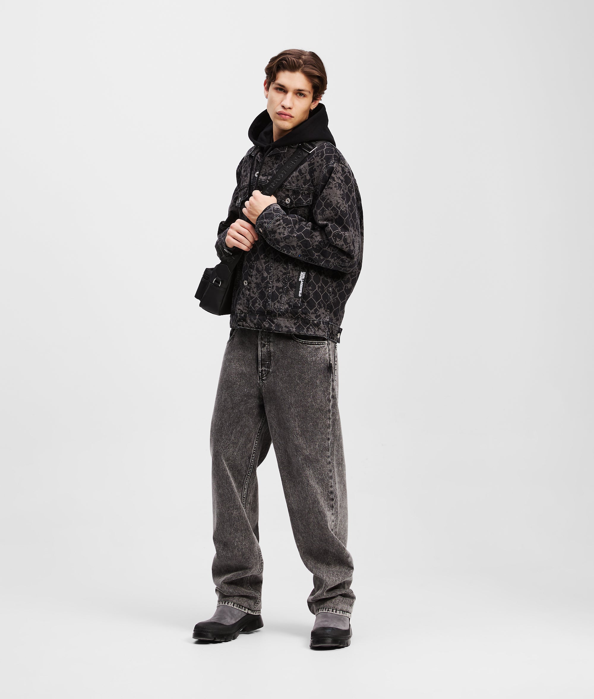 Timeless design with a contemporary twist. this relax-fit denim jacket showcases a bold all-over chain link design that exudes individuality. A branded shank button fastening and practical pockets are complemented by a signature KARL LAGERFELD JEANS leather patch. making this a must-have piece for those who dare to stand out.