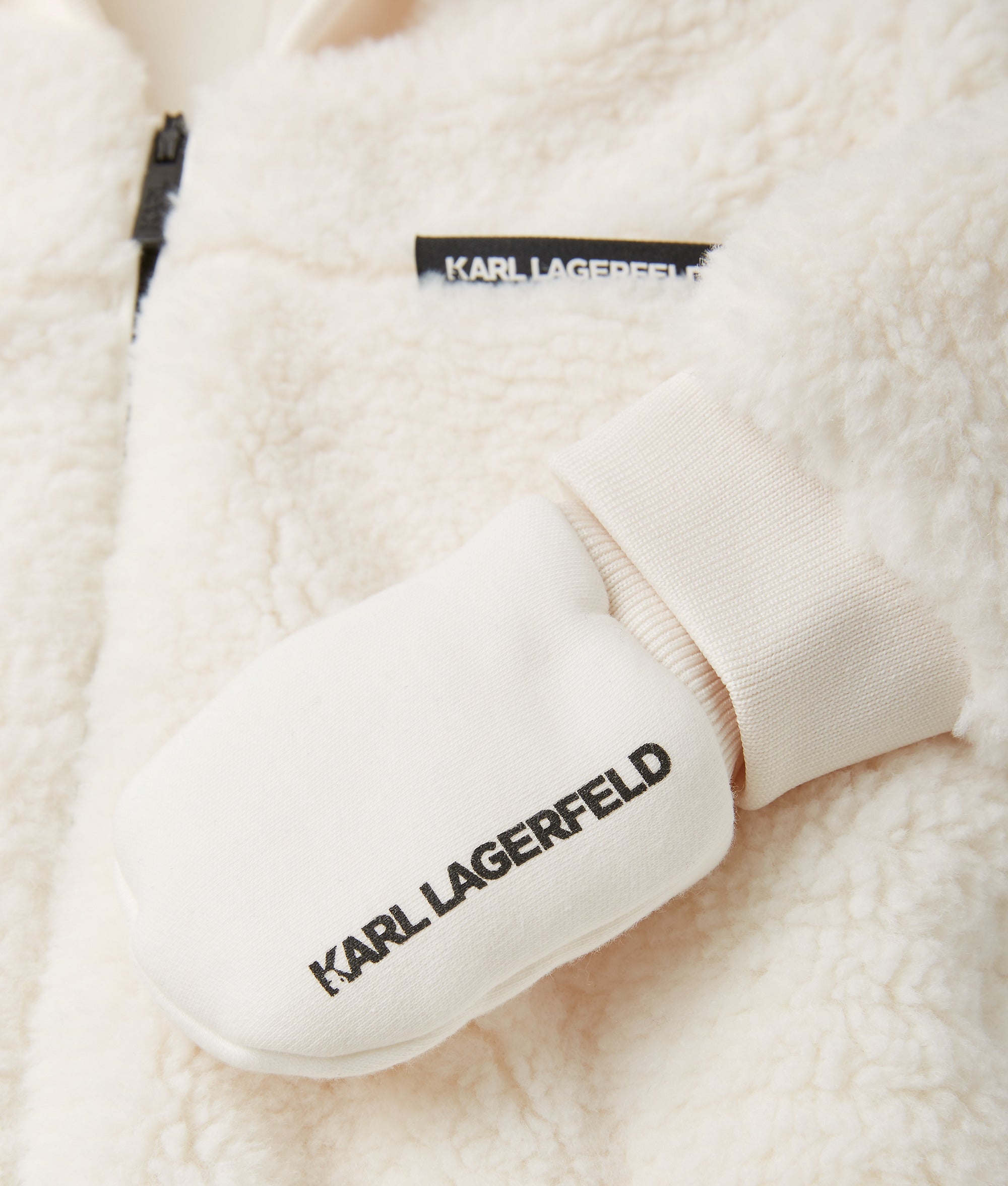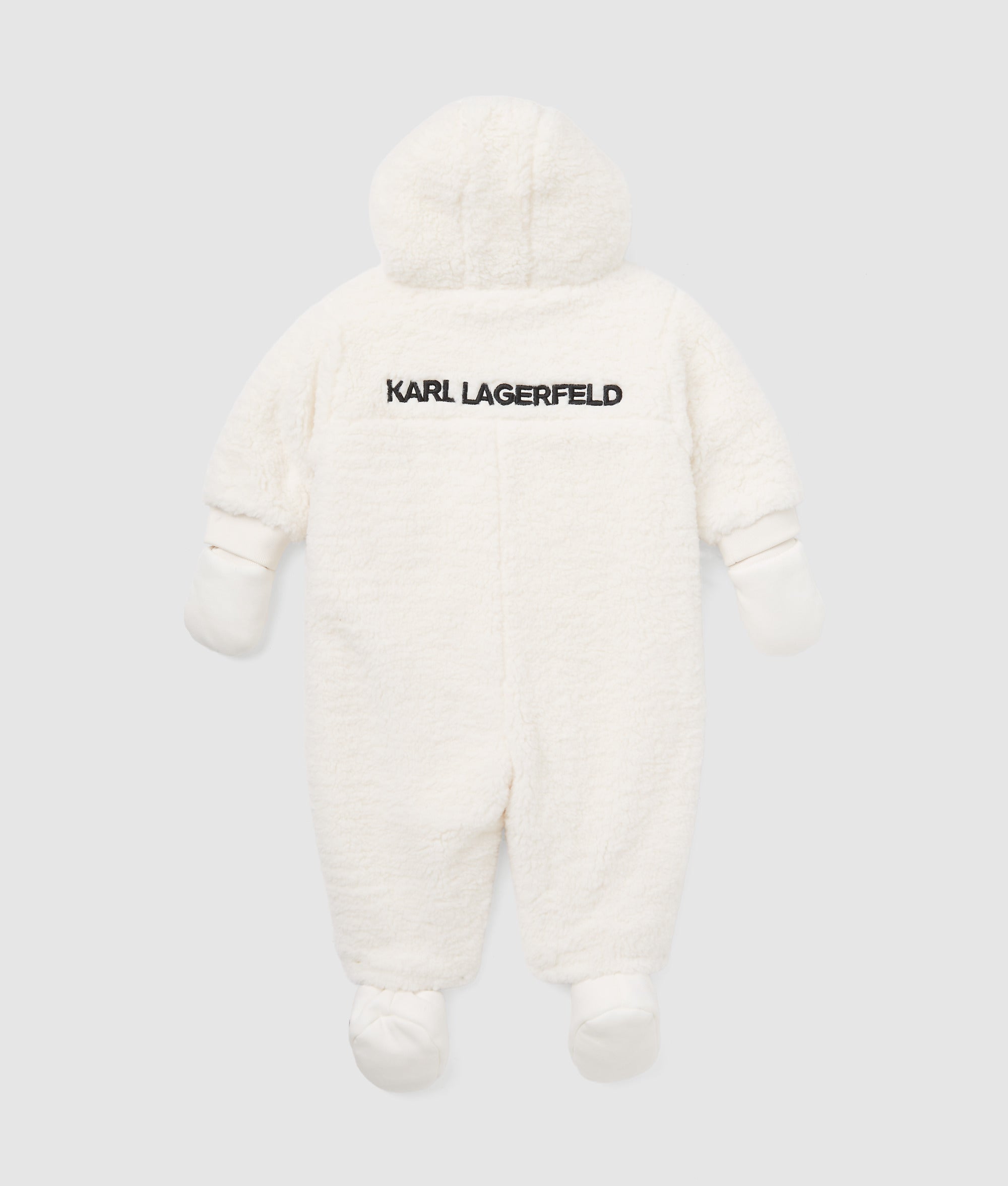 This hooded snowsuit set is completed with cozy faux-shearling gloves and booties. all nestled in a sleek gift box for thoughtful presentation.
