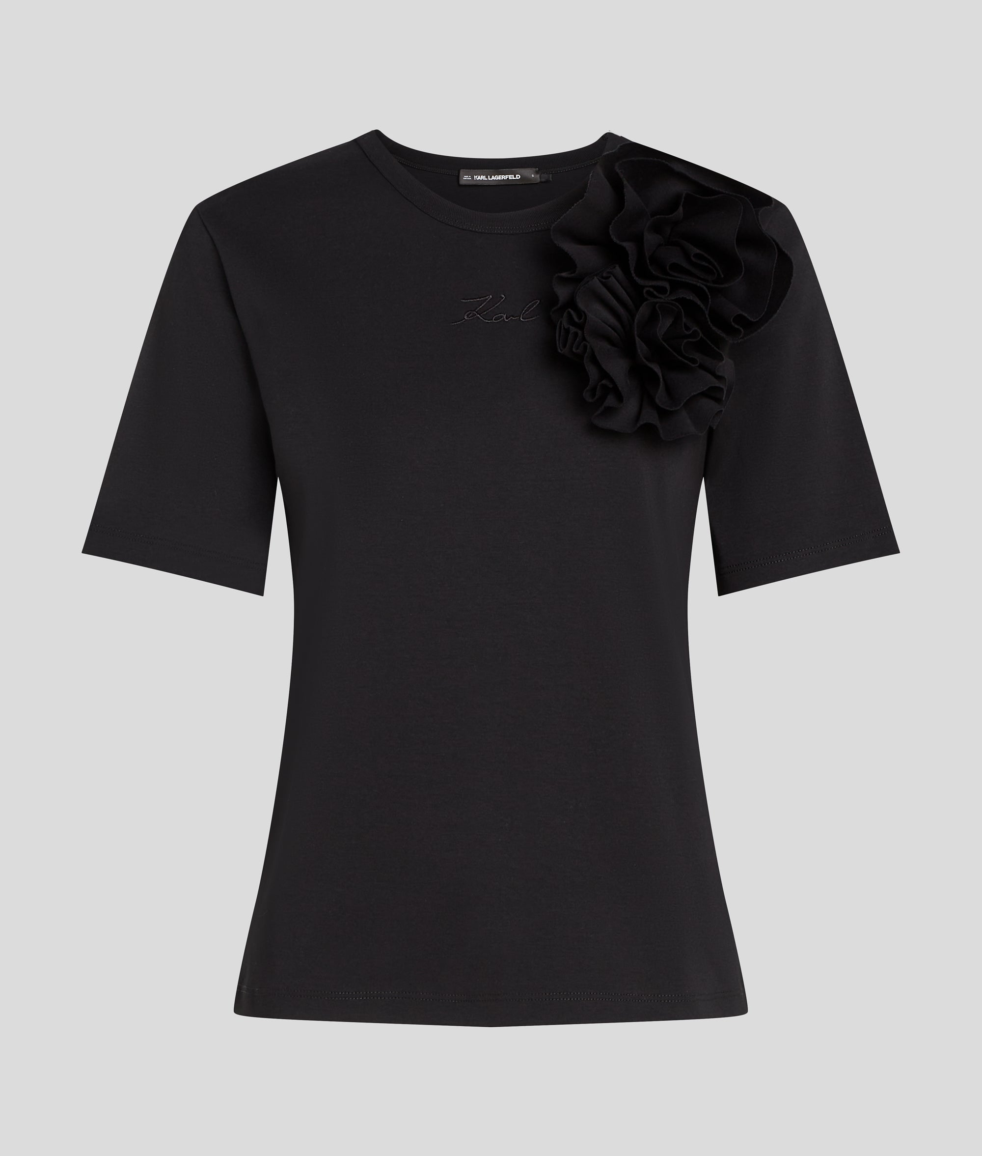 A classic crew neck design meets playful charm with bold floral appliqu??s adorning the left shoulder. This T-shirt effortlessly combines comfort and style for a fresh. sophisticated look.