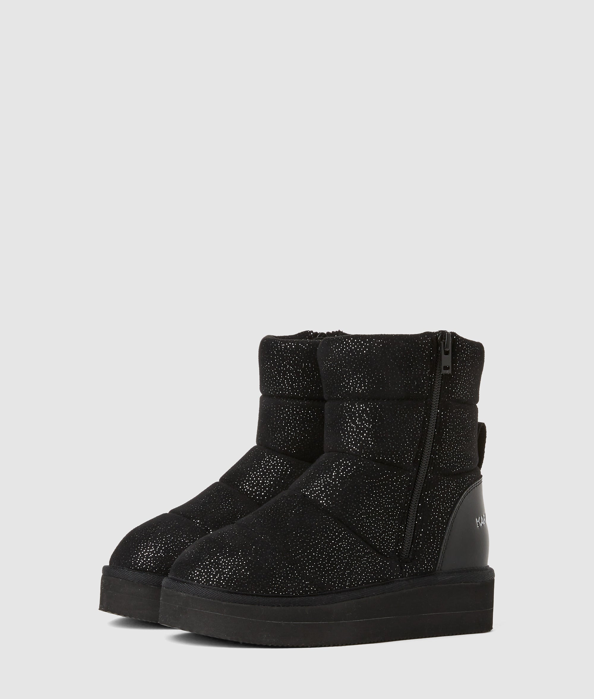 These mid-calf boots are defined by a shimmering. quilted texture and easy side zipper fastening. Breathable lining keeps feet fresh. while metallic accents add subtle edge to winter wear.