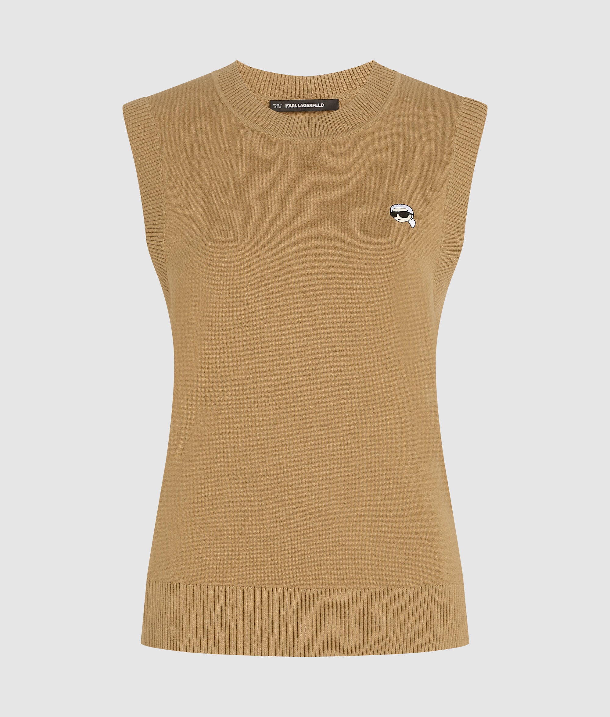 Preppy and polished. this sleeveless vest is detailed with Ikon Karl embroidery at the chest. The crew-neck silhouette is ideal for Sunday lunch dates or layered over a checked shirt for work.