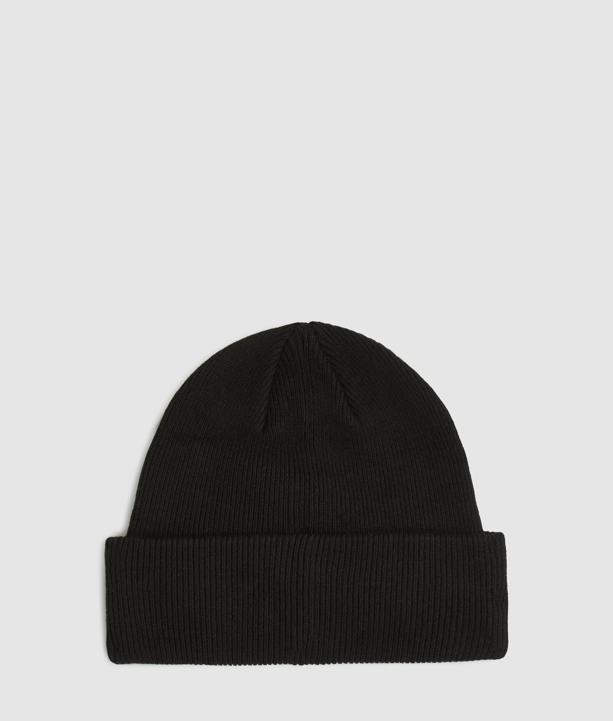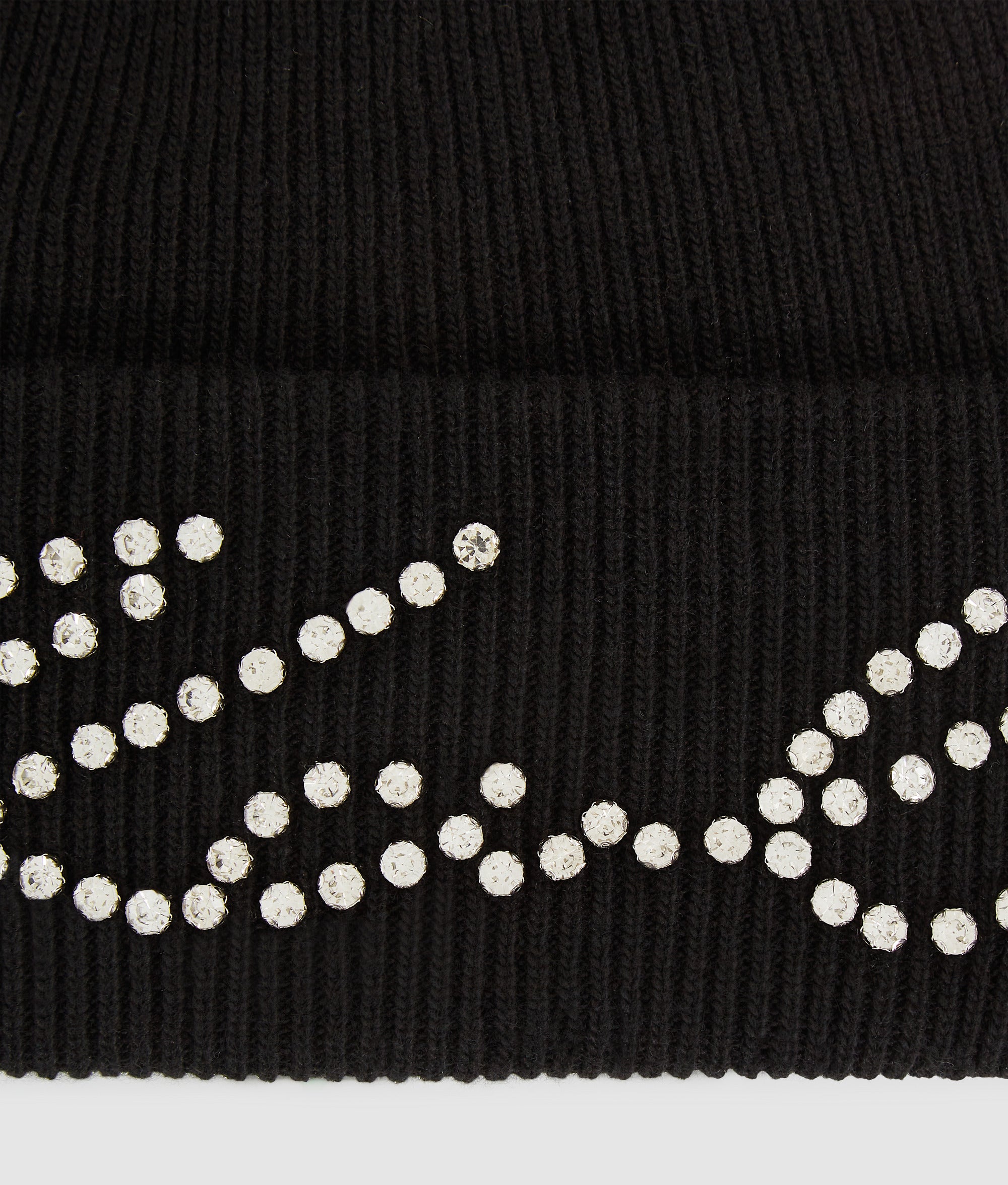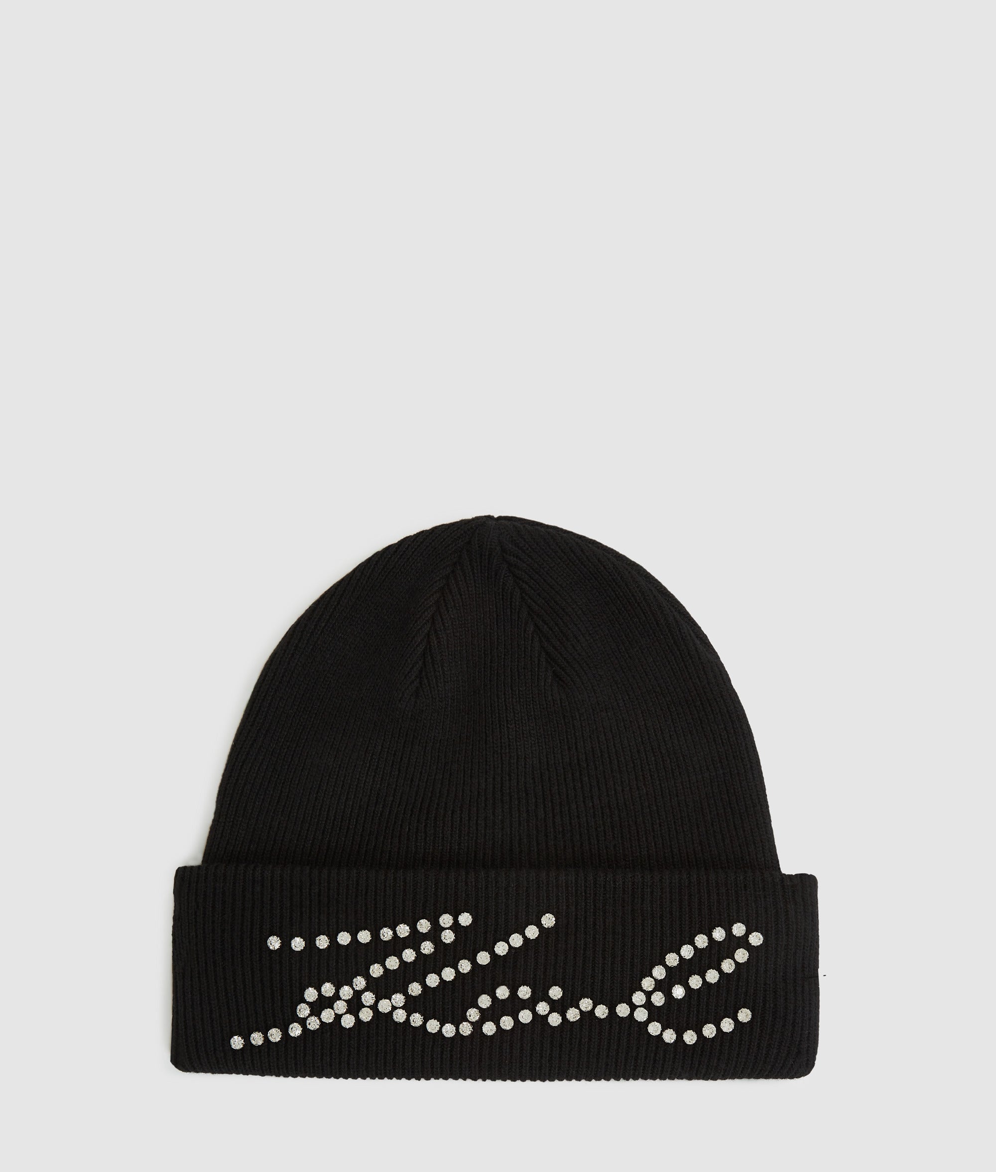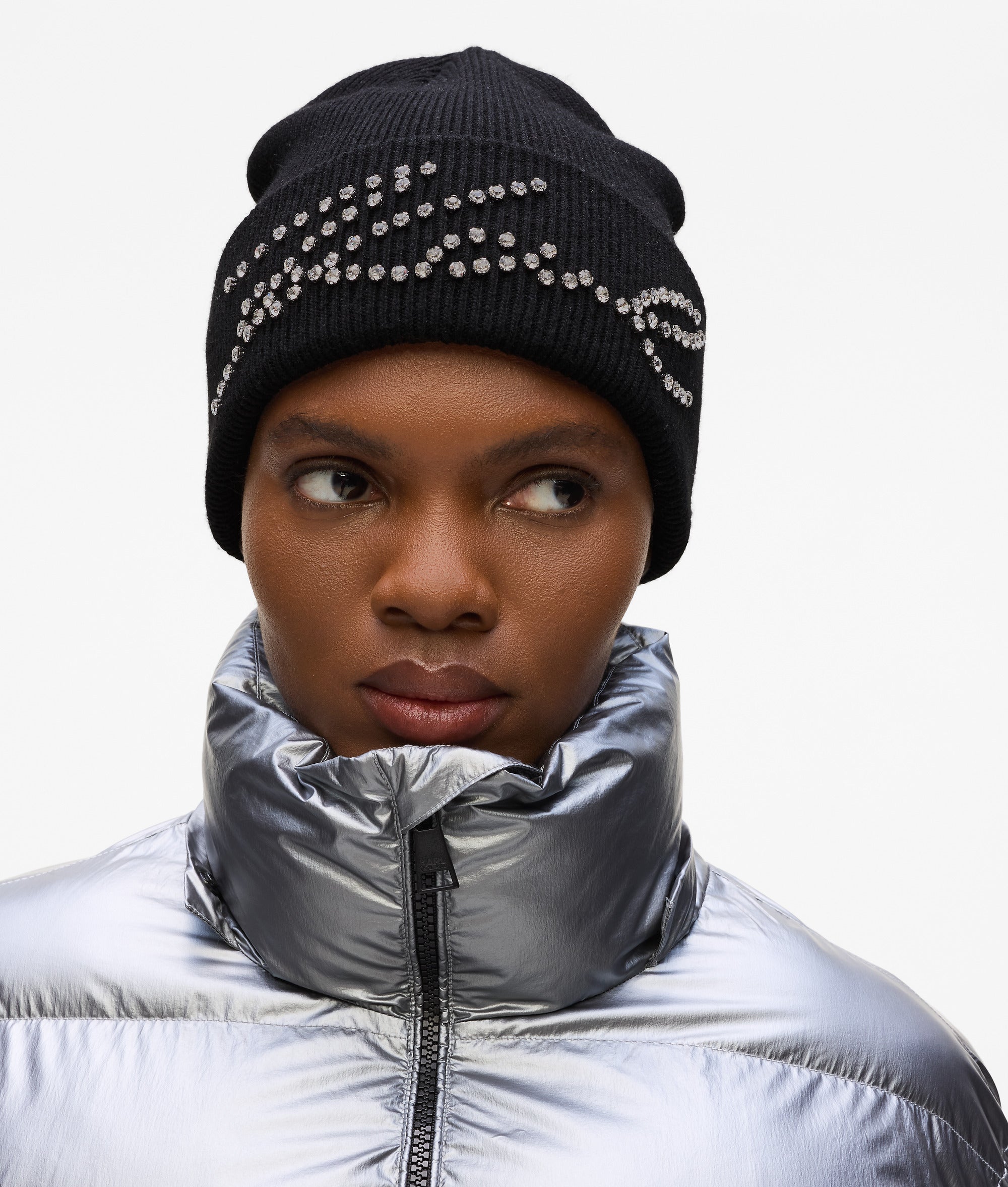Top winter looks with this rib-knit beanie. featuring rhinestone Signature logo embellishment at the folded brim.