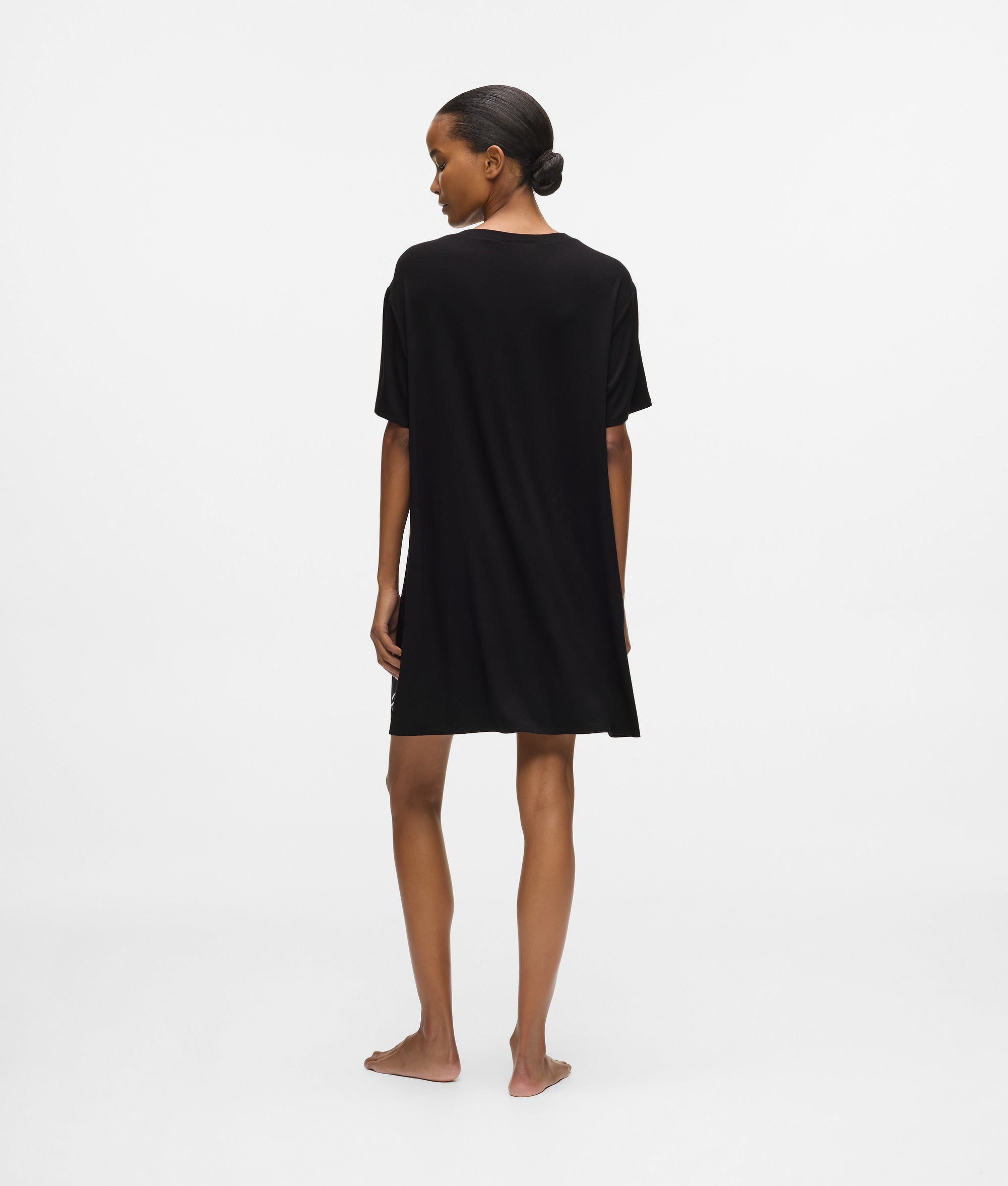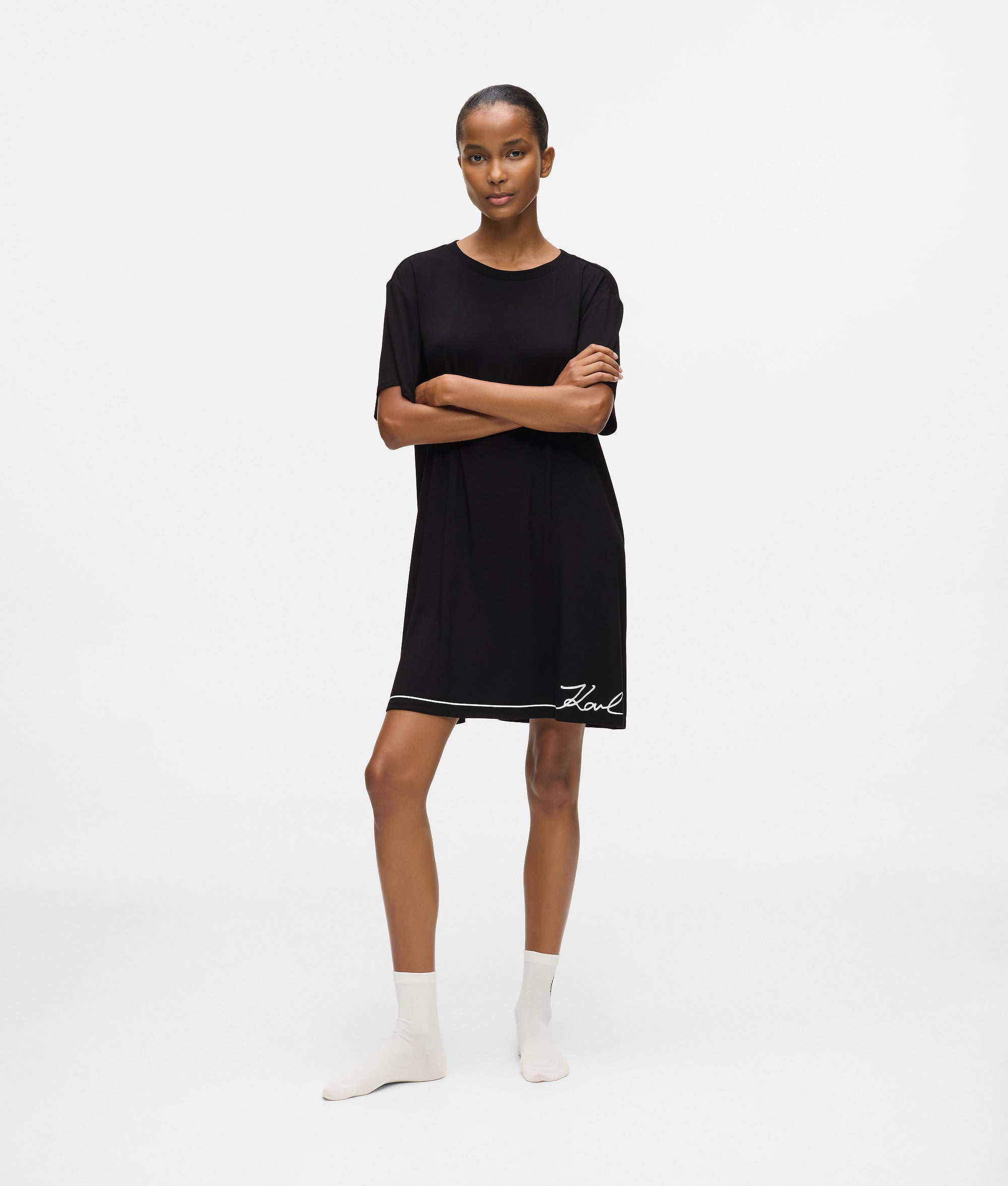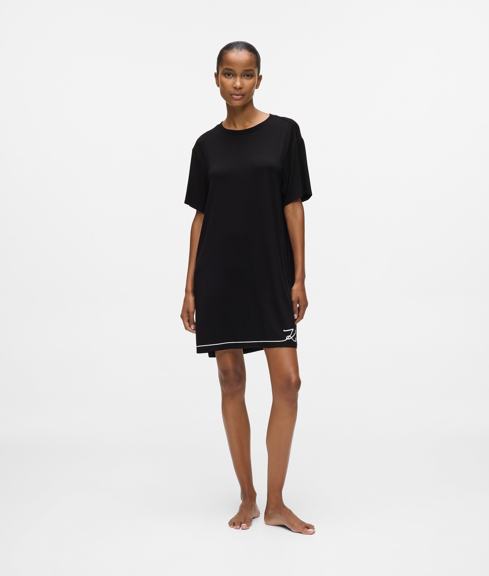 Effortless ease defines this oversized pajama dress. Soft viscose jersey drapes gently. while Signature logo detailing adds refinement to restful moments.
